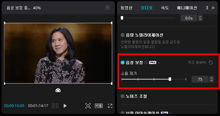 ☞ 음성 보정은 음성에서 노이즈를 제거해 주는 기능입니다. 스크롤 막대를 조절해 노이즈 제거의 강도를 조절할 수 있습니다. 왼쪽으로 갈 수록 노이즈를 많이 허용하고 오른쪽으로 갈 수록 노이지를 적게 허용합니다.