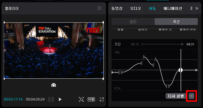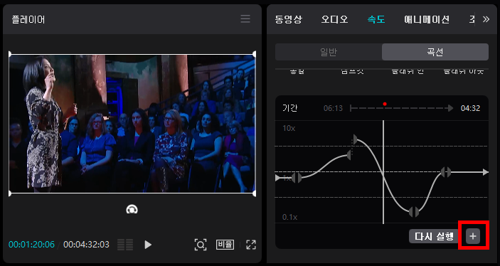☞ 곡선에서 할 수 있는 속도 조절은 "사용자 지정"과 몇 가지 속도 조절 템플릿이 있습니다. 사용자 지정은 직접 속도 조절 점을 추가해서 속도를 변경해야 하고 템플릿은 미리 제공되는 요소들을 수정해서 속도 조절을 하면 됩니다. 속도 조절점을 추가 하는 방법은 변경하고자 하는 위치에 커서를 놓고 다시 실행 옆의 "+" 버튼을 누르면 됩니다. 제거 하는 방법은 제거하고자 하는 속도 조절점 위에 커서를 놓고 "-" 버튼을 누르면 됩니다.