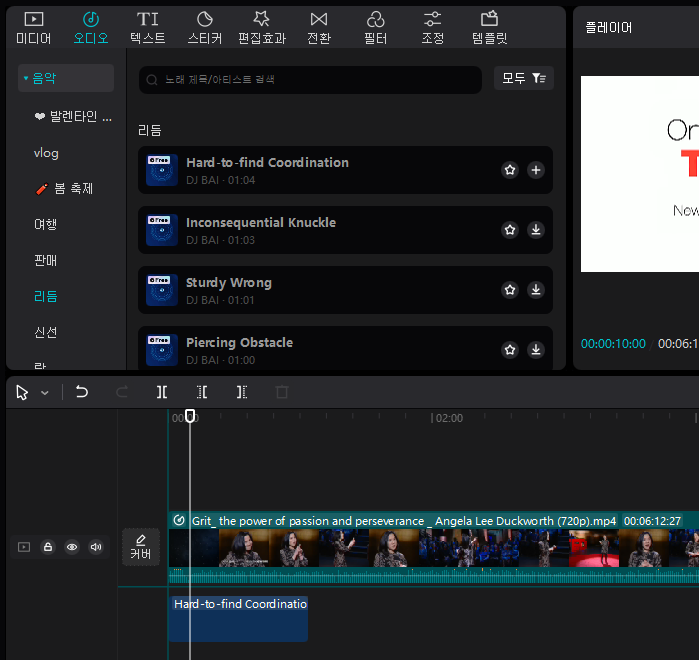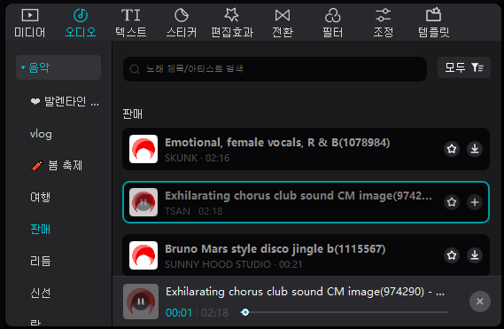 ☞ 오디오 탭에서는 다양한 오디오 파일을 지원합니다. 테마별로 정리되어 있어서 찾기 쉽습니다. 또한 해당 클립을 클릭하면 오디오를 미리 들어볼 수 있습니다. 여러가지 오디오를 들어보고 영상에 맞는 음악을 선택하면 됩니다.