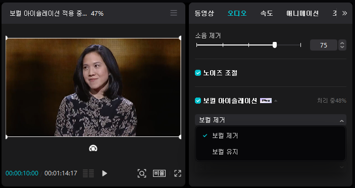 ☞ 보컬 아이솔레이션 기능은 목소리를 제거하는 기능입니다. 오디오에 목소리가 삽입되어 있는 경우 목소리를 제거 할 수 있으며 음악 파일에서 보이스를 제거하고 MR만 남길 수 있는 기능입니다. 보컬 제거와 보컬 유지 두 가지 옵션이 있습니다.