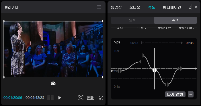 ☞ 영상의 속도를 조절할 때는 영상을 선택하고 세부 정보 패널에서 속도 탭을 선택하면 됩니다. 일반에서는 영상의 속도를 직접 컨트롤 할 수 있습니다. 곡선에서는 속도 변경에 관련된 몇 가지 템플릿을 제공하고 템플릿을 수정해서 영상의 속도를 조절 할 수 있습니다.