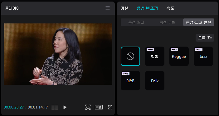 ☞ 오디오의 부가 기능에는 음성 변조기가 있습니다. 음성 필터를 사용해 음악을 전혀 다른 분위기로 연출 할 수 도 있고 음성 유형을 변경해 다양한 음성으로 변조가 가능합니다. 또는 음성을 노래로 변환 할 수도 있습니다. 음성을 노래로 변환할 경우는 5~60초 사이의 구간만 가능합니다.