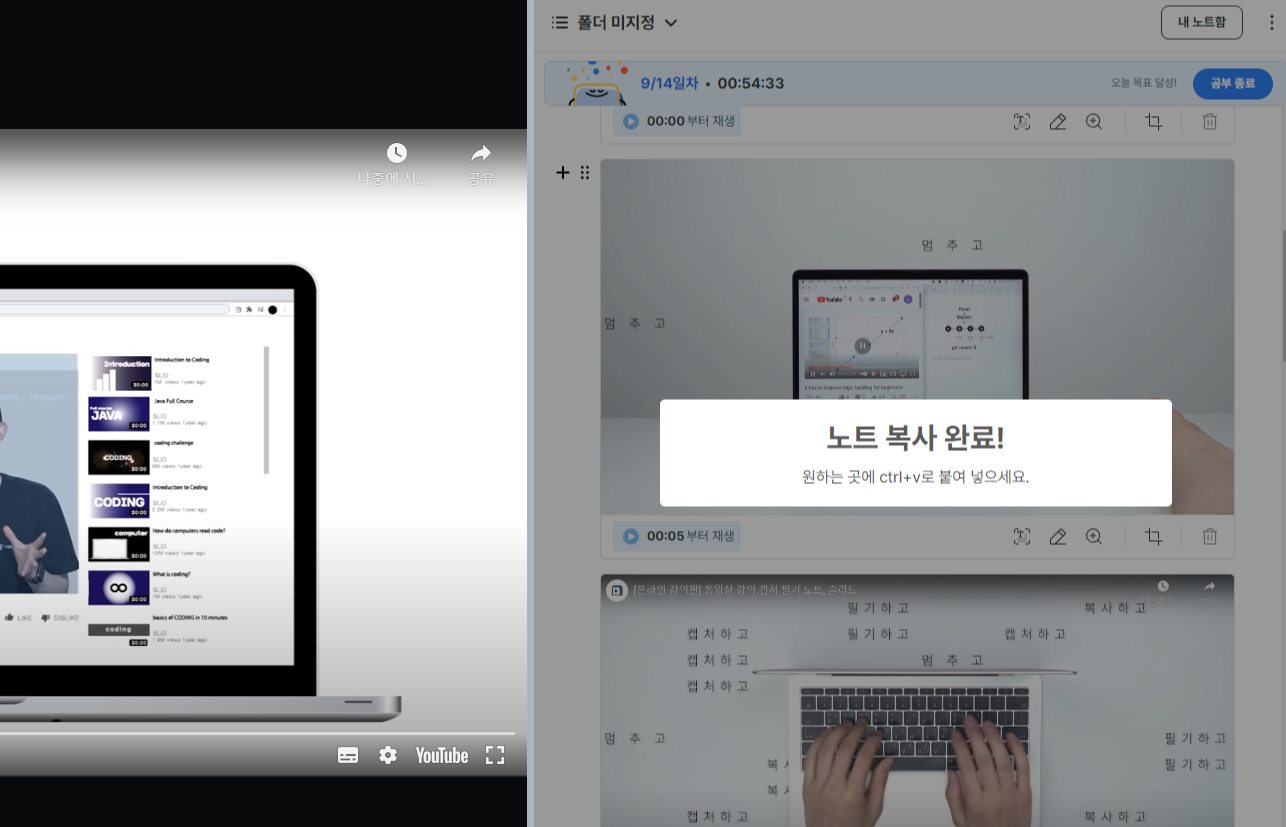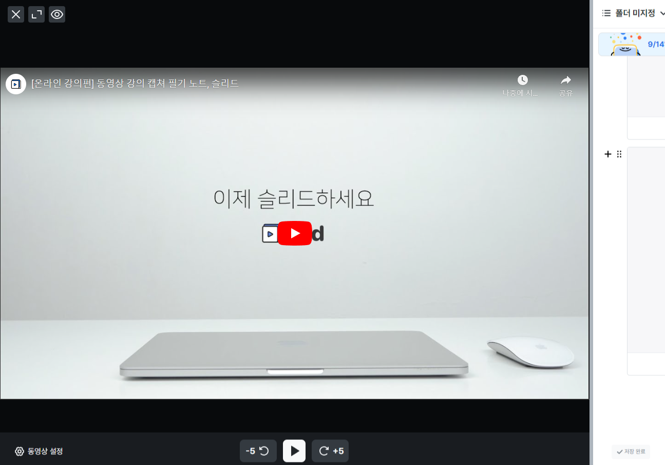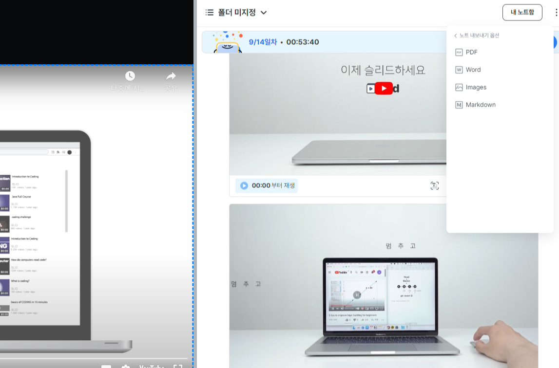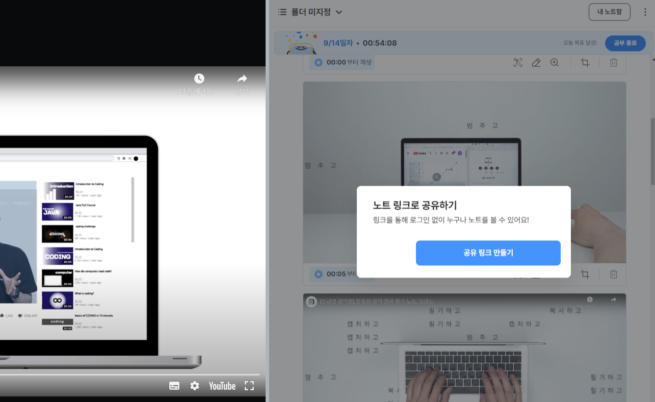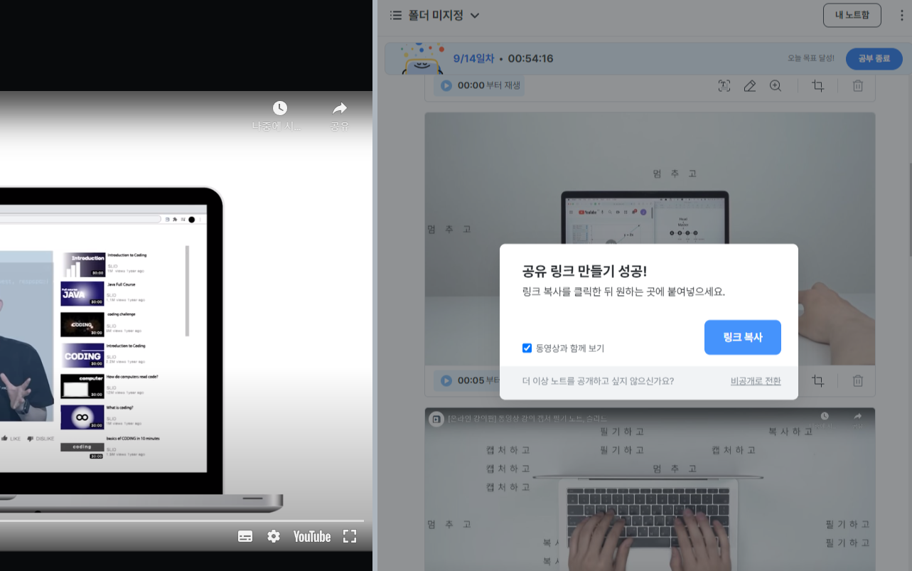 - 노트만 공유할 수도 있고 해당 영상을 함께 공유할 수도 있습니다.
