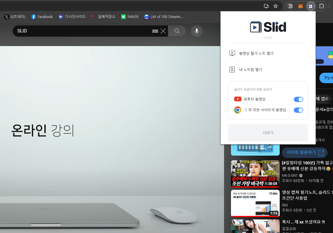 - 단, 페이지가 독립적으로 실행(새창으로 열림)이 되어 SLID 확장 앱을 쓸 수 없는 경우는 데스크탑 앱을 사용해야 합니다. (슬리드 바로가기 버튼을 사용할 수 없는 경우!!!)