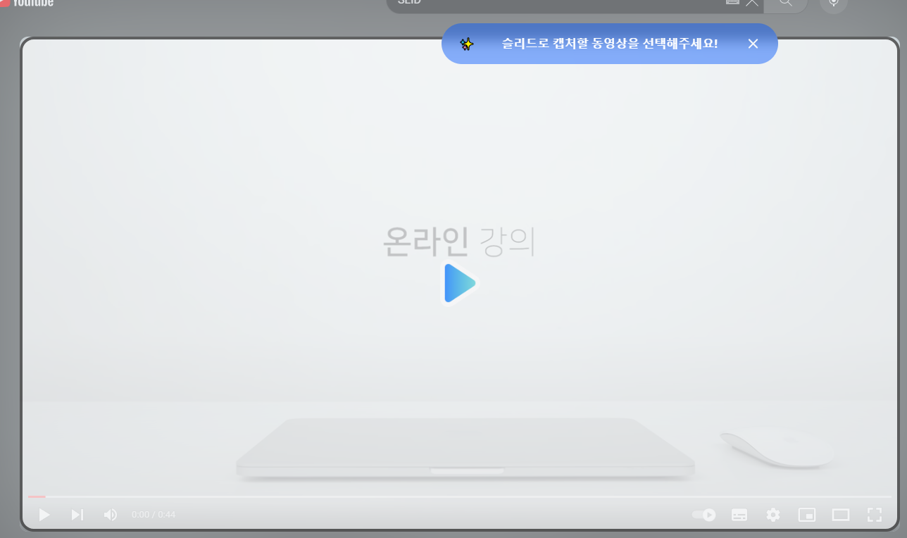 2. 동영상 필기 노트 열기를 선택하면 "슬리드로 캡쳐할 동영상을 선택해주세요!"라는 메시지가 뜨며 영역이 표시됩니다. 파란색 시작 버튼을 클릭하면 됩니다.