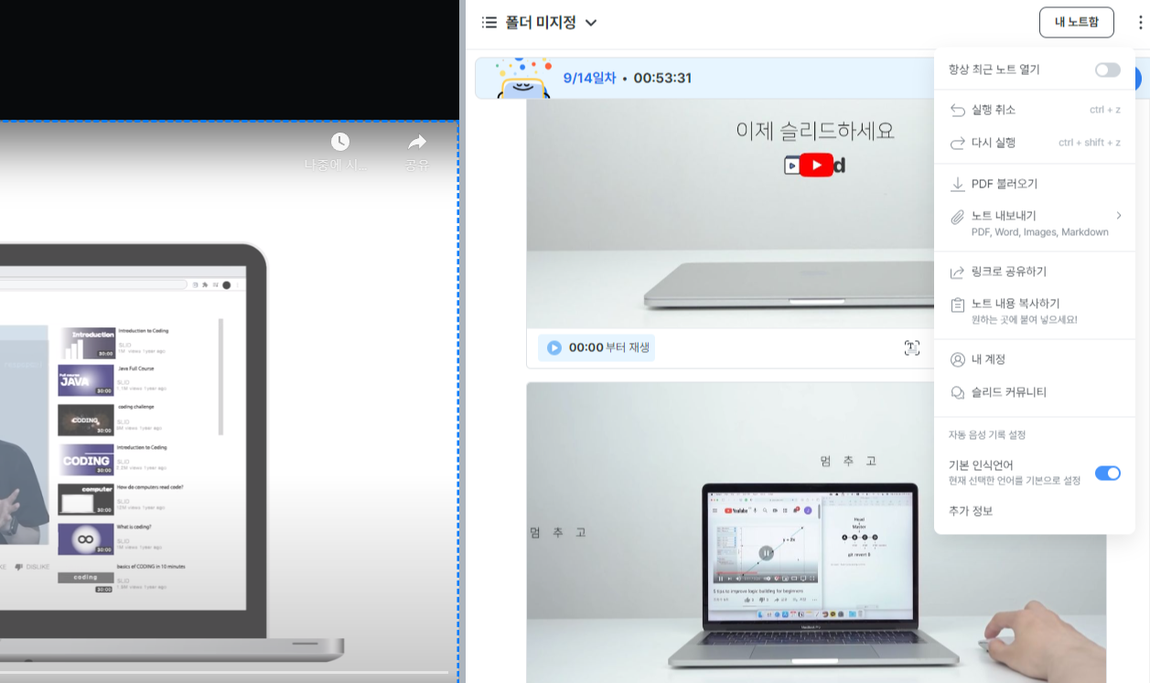 - 최근 노트 이어서 쓰기 - 기존이 사용한 노트가 있거나 유사한 노트가 있으면 불러오기 해서 이어서 쓸 수있습니다. 또는 동영상을 한 번에 시청하지 못하고 나누어서 시청을 해야 할 경우 이어서 쓰는 용도로 활용합니다.