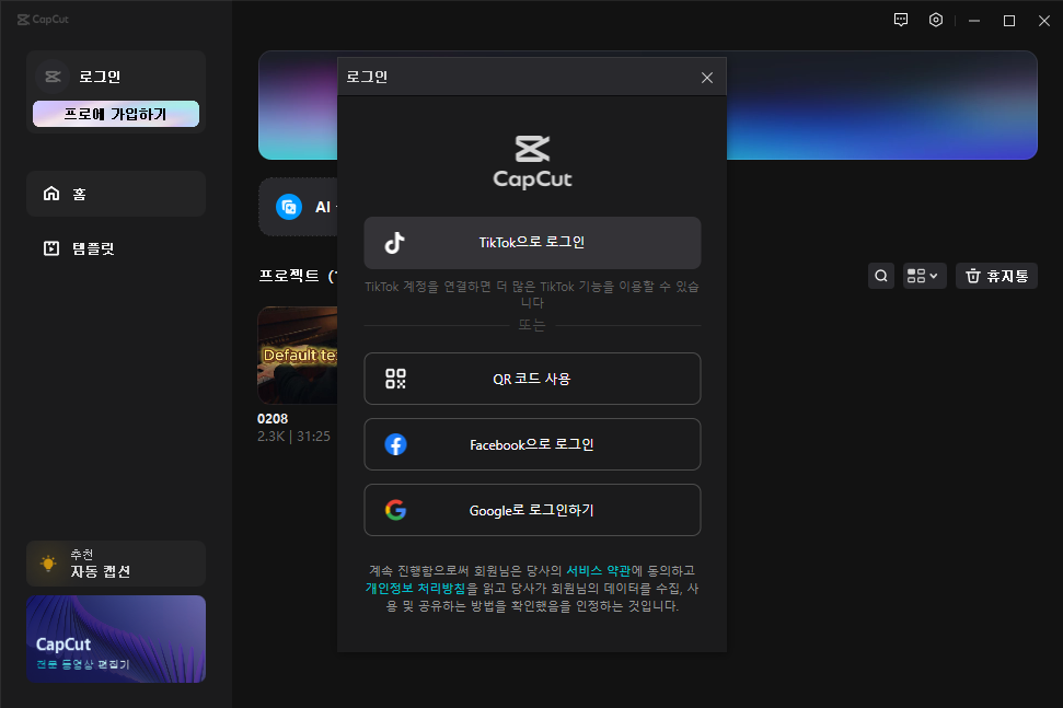 CapCut 로그인 및 연동