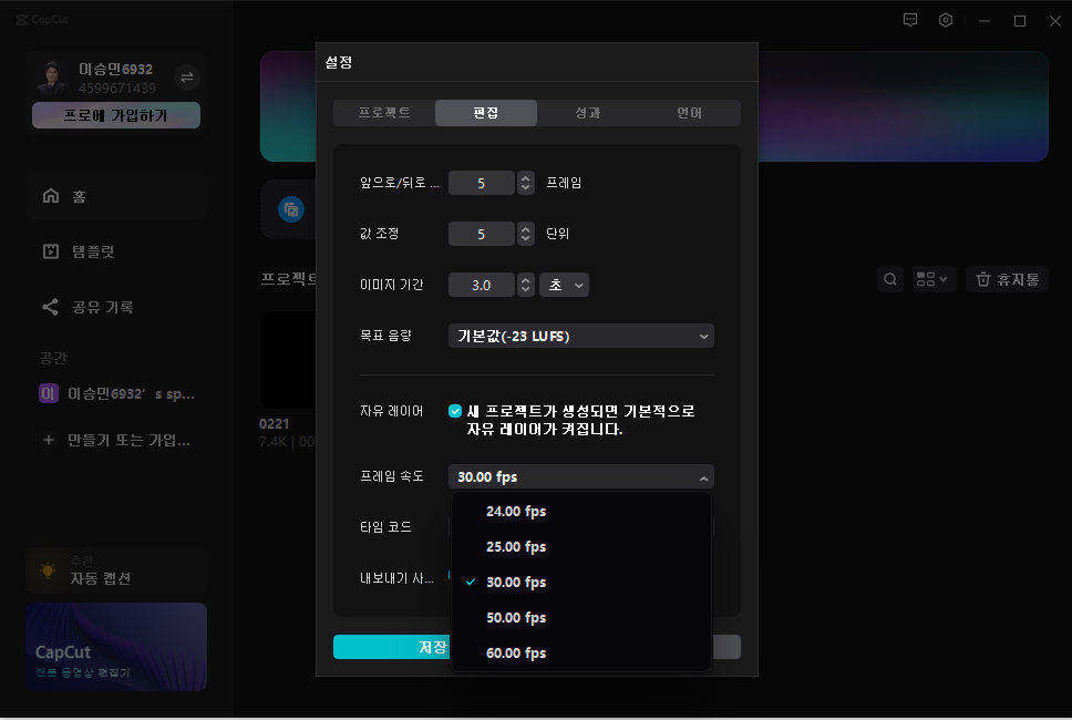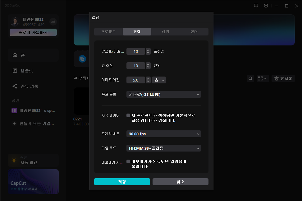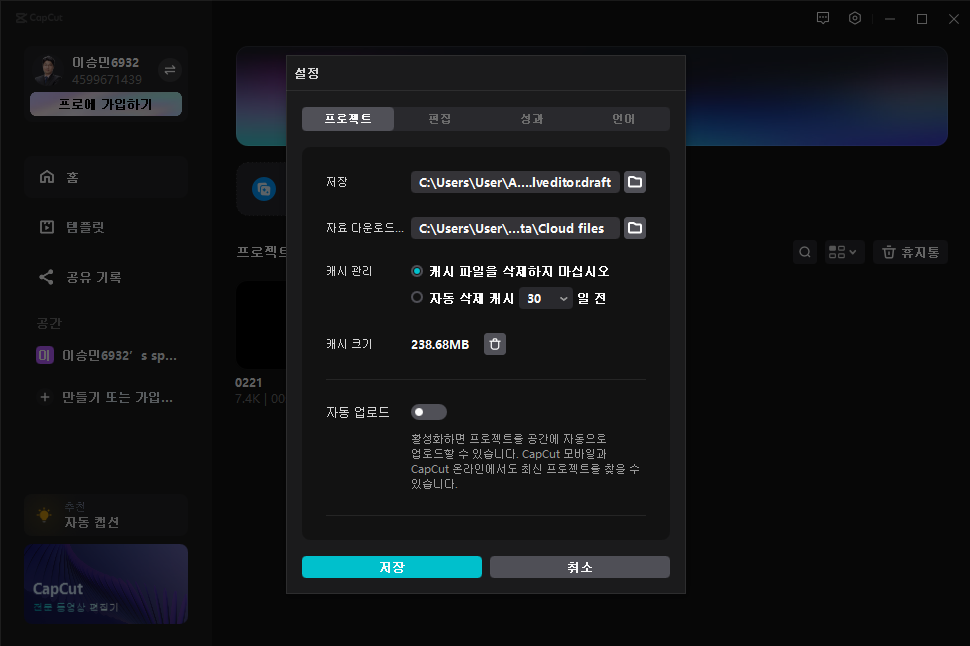 CapCut 기본 설정 - 프로젝트