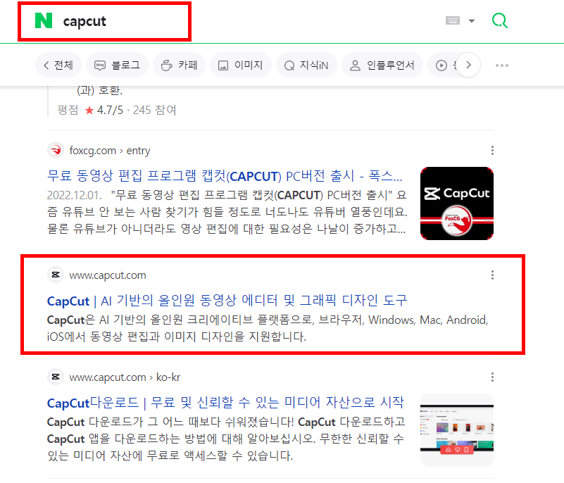 자주 쓰는 브라우저에서 캡컷 검색